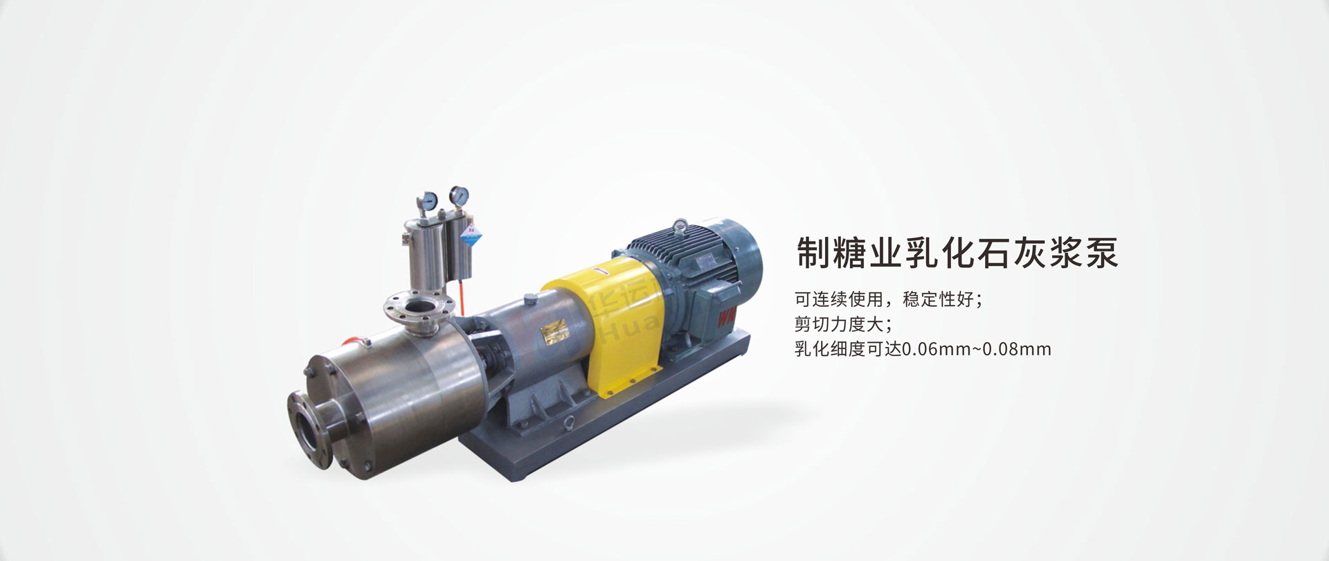 合肥華運機械制造有限公司生產的制糖業乳化石灰漿專用泵是一種集輸送和高剪切乳化為一體的特殊泵,乳化石灰漿專用泵的應用,克服了糖廠多年來因石灰漿難以細化,從而引起后反應,導致蔗汁中和及澄清汁PH值難以控制,最終影響產品質量的現象