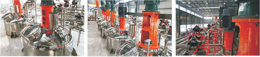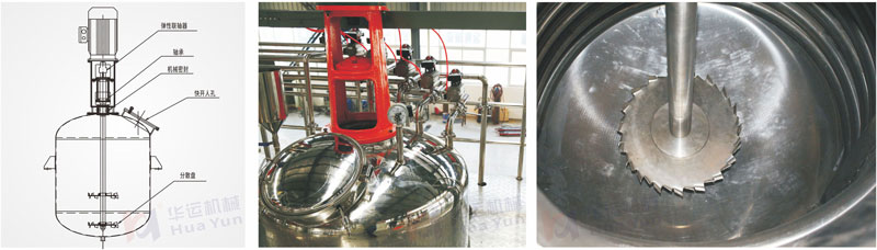 傳統的設備是敞口的攪拌罐,采用人工投料方式,粉塵污染大。我公司采用全密封生產方式,真空負壓進料,在密封容器中安裝高速分散機,無粉塵污染。高速分散機帶冷卻水的機械密封、NSK軸承、彈性聯軸器等工藝,品質保證,維修方便。