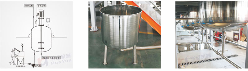 開啟稱重罐出料及生產罐進料氣動閥門,同時打開真空閥門,從罐底通過真空吸入已經稱量好的粉料。